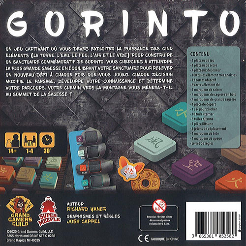 Dans Gorinto, vous allez devoir montrer votre niveau de sagesse en établissant un temple en respectant les différents éléments de la nature. Plus vous arrivez à atteindre vos objectifs, plus le chemin de la sagesse vous ouvre les bras. Vous devez réfléchir à la manière dont vous souhaitez agencer votre temple en faisant de votre mieux pour atteindre les objectifs qui vous sont imposés. Chaque objectif étant tiré au hasard, vous allez pouvoir profiter de faire plusieurs parties pour mettre au défi votre stratégie. Faites preuve de tactique pour prendre les tuiles intéressantes pour vous. Gérer votre main pour le placement de vos ressources et pour récupérer ce qui vous intéresse le plus. Atteignez un niveau de sagesse proche de celui de Dalaï-lama et de Bouddha pour que votre Gorinto soit le plus célèbre du Japon, mais surtout le plus harmonieux avec les éléments.