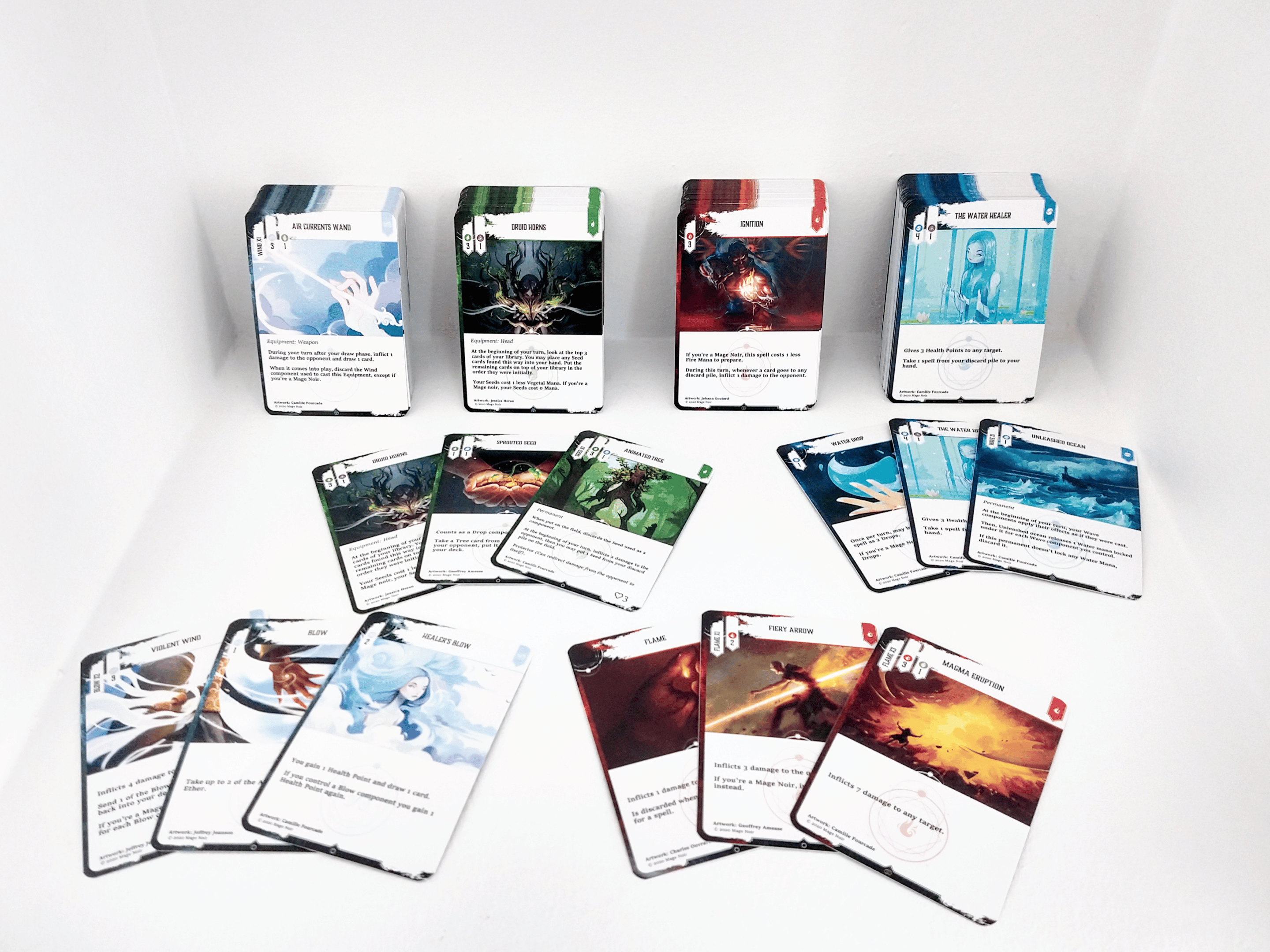 Il s’agit d’un jeu de deckbuilding où la préparation de votre paquet de cartes va vous prendre la majeure partie de votre temps de mise en place. Pour une première partie, le livret de règle vous donne les cartes pour la construction d’un deck de départ en fonction d’un élément (eau, terre, feu, air). Il est évidemment possible de mélanger les éléments, mais c’est recommandé de le faire après avoir pris en main le jeu (souvent, après la première partie, vous allez avoir envie de tester de nouvelles combinaisons.)